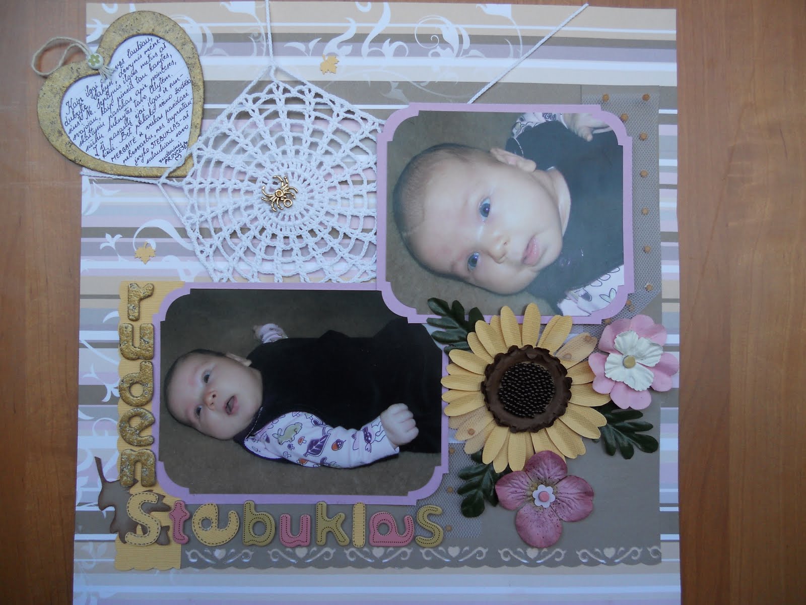 Mano vyras - aistringas žvejys. Kaip ir kiekvieno žvejo svajonė - pagauti kuo įspūdingesnį laimikį, o po to juo ir pasipuikuoti :) Šiame LO auksinė žuvelė įkūnija tą svajonių laimikį. Tai konkursinis darbas, kuriame buvo prašoma panaudoti "vellum". Naudojau raštuotą vellum: debesėlis vandens pavidalu, iš kurio išnyra žuvelė ir apačioje "ežeras". Meldai daryti iš floristinės juostelės, rudosios dalys - iškirptos iš filco. Daugiausiai darbo pareikalavo auksinė žuvelė. Ji iškirpta iš keturių sluoksnių ir klijuota su iškiliais kvadračiukais, kad būtų 3D efektas. Šį "šedevrą" su vaikais padovanojome brangiausiajam tėčio dienos proga :)